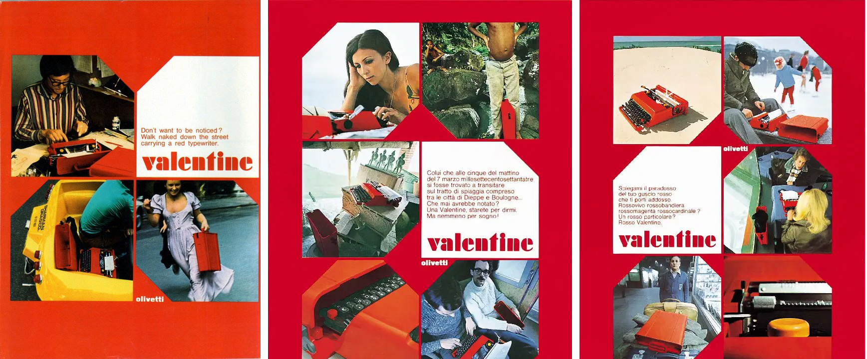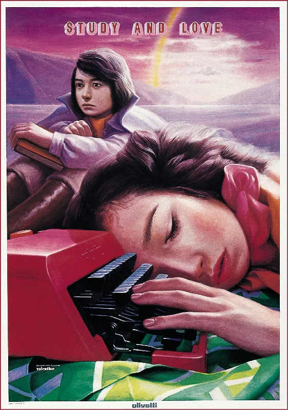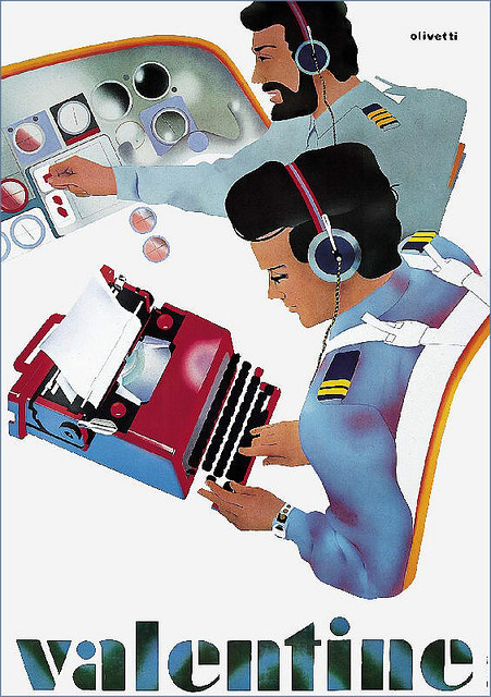در کمپین تبلیغاتی که توسط آدریان ون‌دراِلست(Adrianus Van Der Elst) تصویرسازی شده است، زنی جذاب ماشین تحریر را مانند یک کیف دستی به راحتی روی شانه خود حمل می‌کند، که نشان می‌دهد می‌توان ولنتین ۴.۵ کیلوگرمی را مانند یک دوربین دستی در پروازهای طولانی با خود برد. ولنتین بهترین دوست شما و معشوق جدیدِ شیکِ شماست، همیشه آزاد و بدون تجمل. شرکت اولیوتی ژاپن نیز در تبلیغات خود از سوگواری به عنوان راهی برای جذابیت بخشیدن به فناوری خود استفاده کرد. پوستر «دانستن و عشق» اثر تاداکی کاناساشی و تسرو ایتو(Tadaaki Kanasashi and Tesro Itoh)، با زنی که سرش را کنار ماشین تحریر گذاشته و شخصی درمانده پشت سر او نشسته است، به نظر می‌رسد هم حس ارتباط عاطفی و هم حس دل‌شکستگی را القا می‌کند.